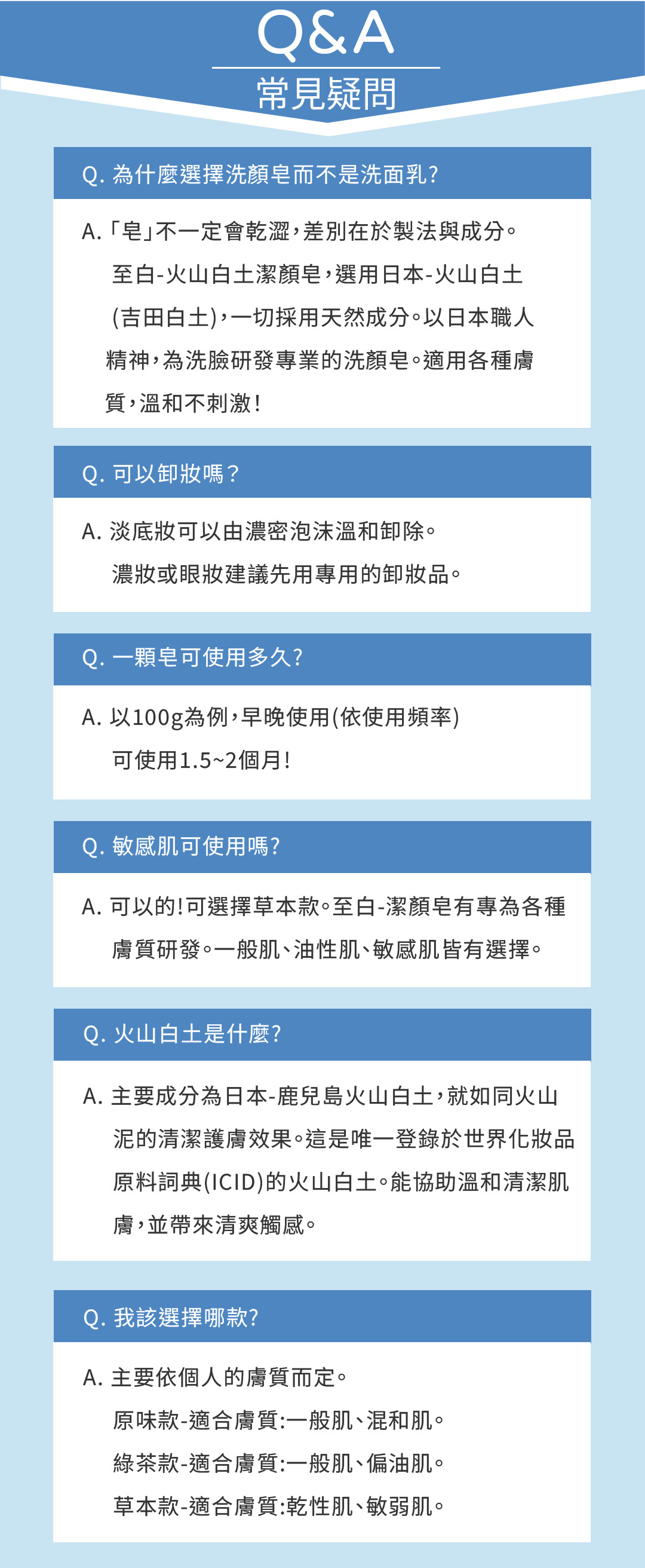 成分:皂基(椰子油皂化物)、火山灰(吉田白砂/火山白土)、香料、甘油、綠茶粉、角鯊烷、玻尿酸、二氧化鈦、橄欖果油、生育酚、蜂膠萃取