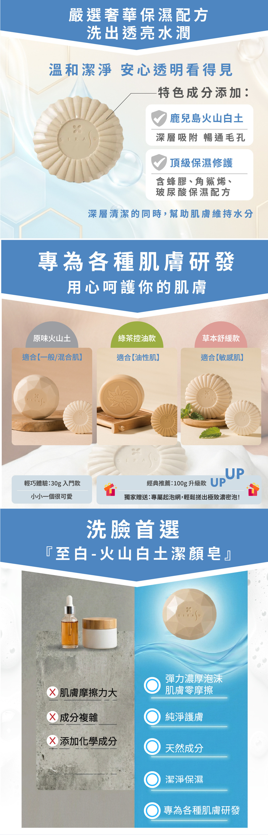 成分:皂基(椰子油皂化物)、火山灰(吉田白砂/火山白土)、甘油、香料、角鯊烷、玻尿酸、二氧化鈦、橄欖果油、生育酚、蜂膠萃取物